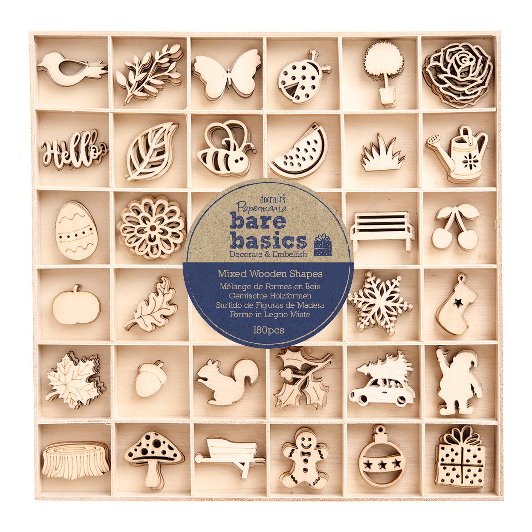 This gorgeous pack from Bare Basics contains 180 Wooden Shapes. Featuring 35 mixed designs from our wooden shapes collection. Perfect for creative card making scrapbooking. Also can be used as embellishments for homemade decorations event ornaments and much more! Add paint glitter or simply leave natural.