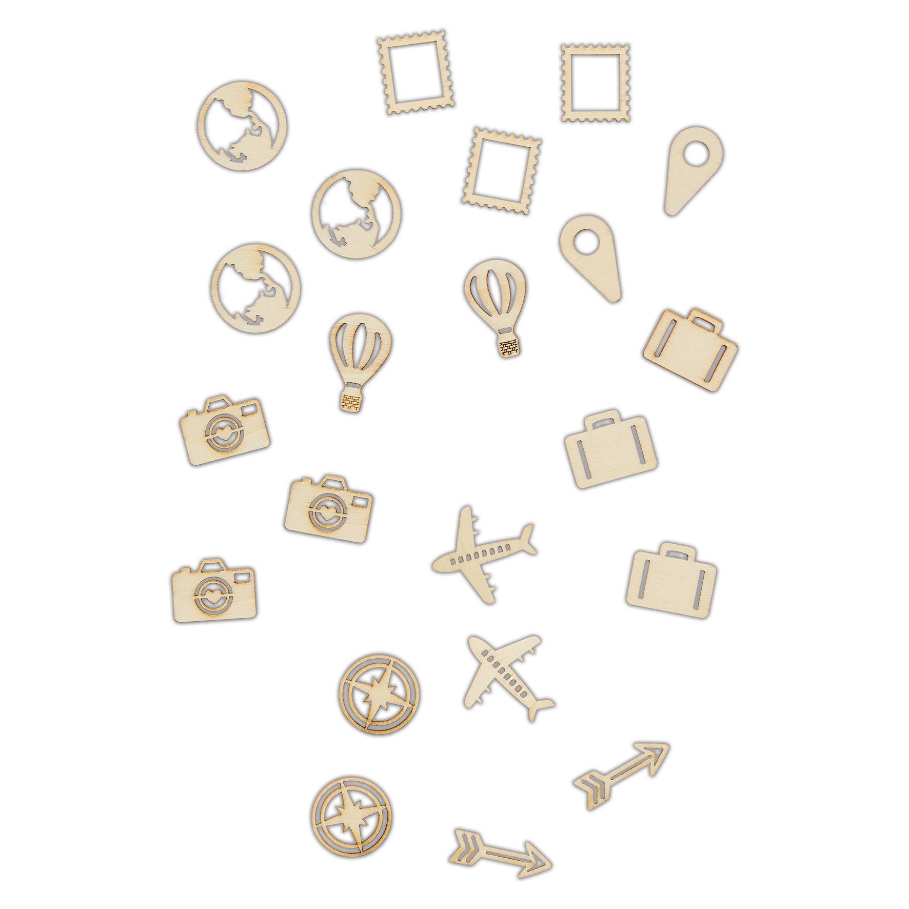 This gorgeous pack from Bare Basics contains 20 Wooden Shapes. 4 travelling themed designs. Perfect for creative card making scrapbooking and more. Add paint glitter or simply leave natural. Size approximately 30 x 30mm.