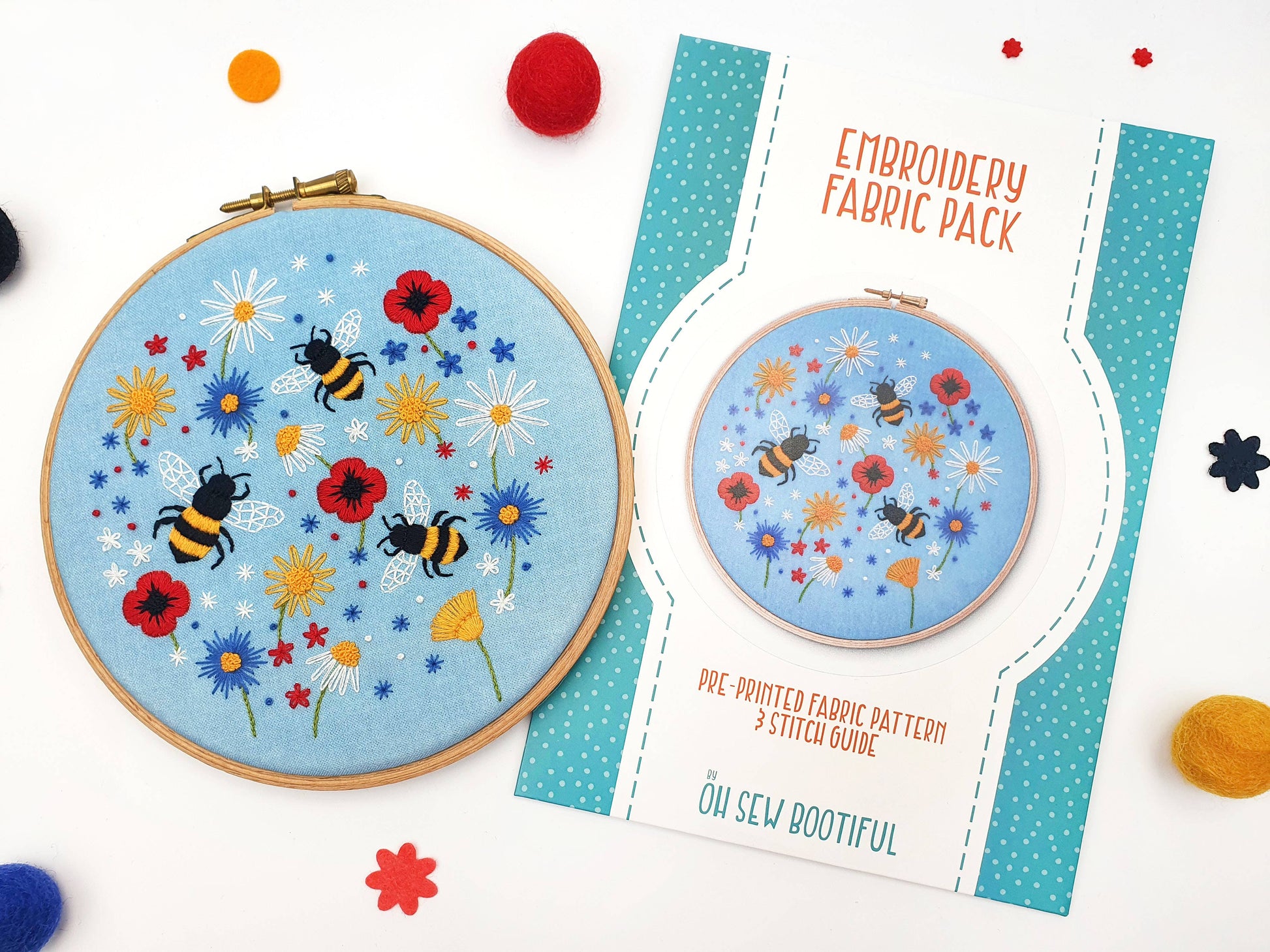 Bees and Wildflowers Handmade Embroidery Pattern Fabric Pack