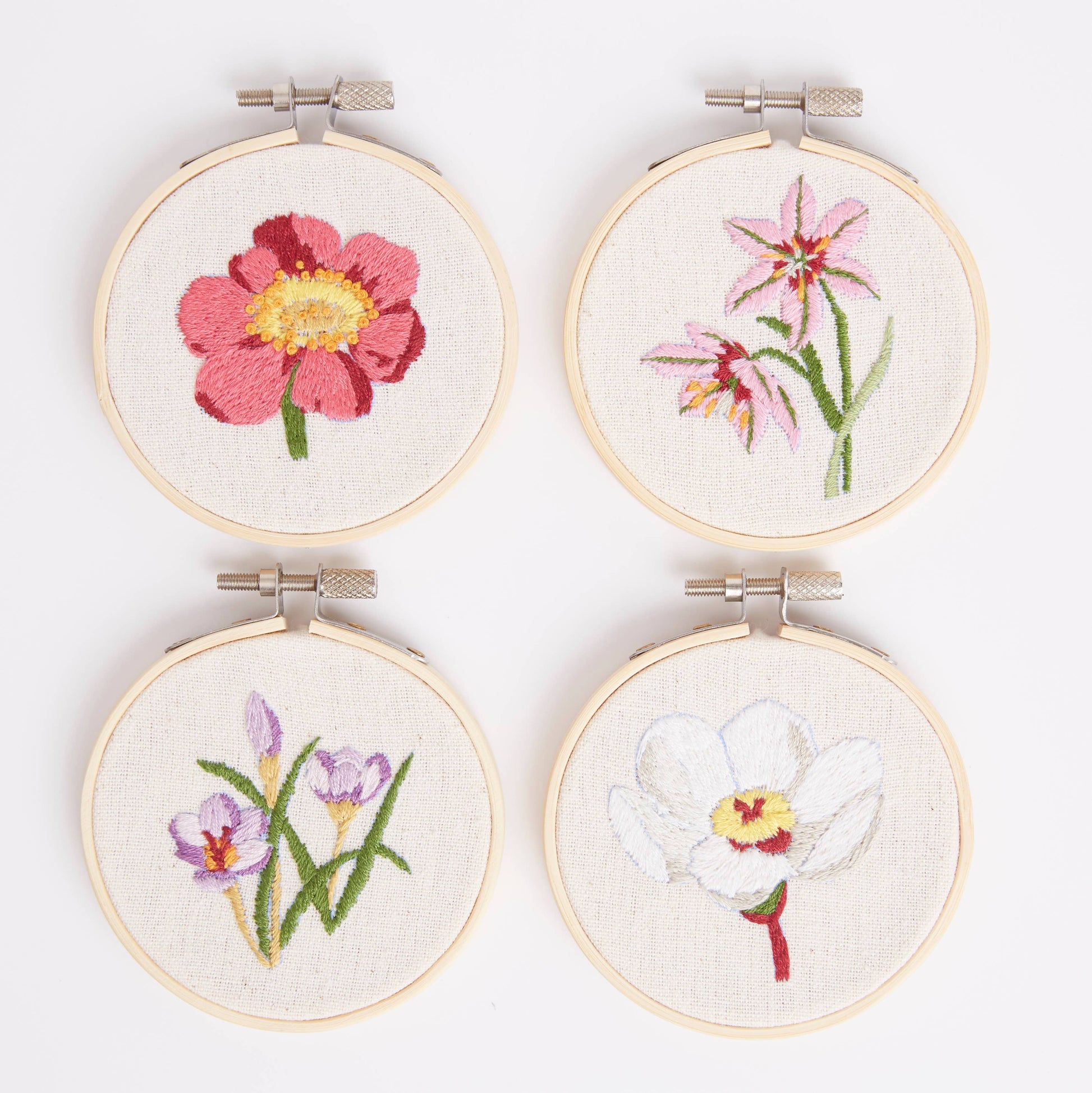 EMBROIDERY KIT INCLUDES 4 x 9cm bamboo embroidery hoops, 4 x printed fabric, 4 coloured embroidery threads, needles and needle Threader as well as detailed instructions. The hoops features a screw to adjust the tightness of the cloth.
